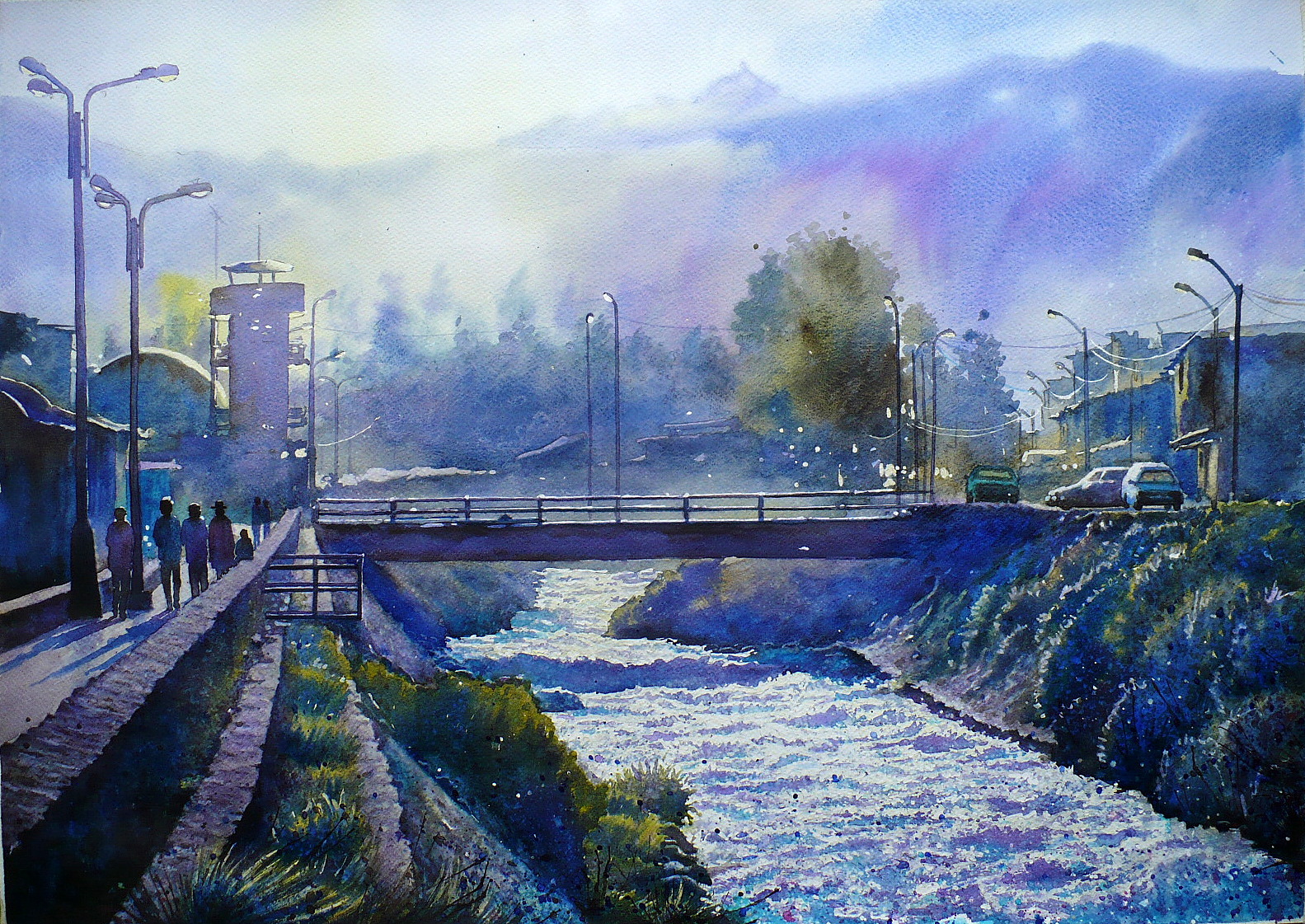 Y es que la premisa de su itinerario de vida se aplica muy bien como alusión y contraste; así lo expresan el paisaje natural que funciona de algún modo como telón de fondo inicial en la nueva mirada del artista, y aquella iconografía huaracina de tonalidades etéreas pero que transparentan muy bien los elementos citadinos de la nueva Huaraz: edificaciones de fierro y cemento, exceso de letreros publicitarios, multitudes humanas, vehículos modernos, abundancia de tendido eléctrico, etc. Con tales elementos, estamos sin duda frente a uno de los contenidos más novedosos de la acuarela nacional: la versión integral de nuestro actual contexto urbano-andino.